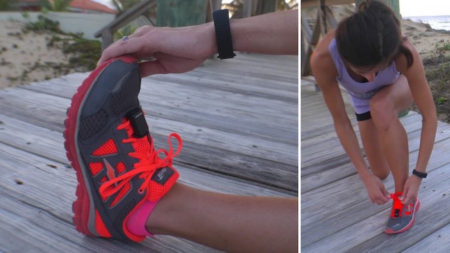 The Shoe Pod snaps into a plastic clip. You can slip this clip onto your shoelaces. The shoe pod is intended to collect data while you are working out. The Shoe Pod is only splash proof, not waterproof.